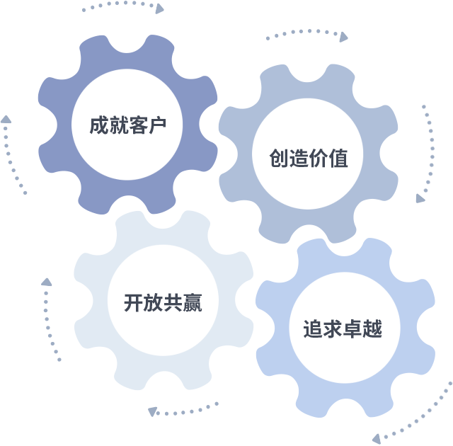 成就客户是一切决策的出发点,,创造价值是衡量所有工作的标准,,,,追求卓越是我们做事做人的态度,,开放共赢是我们的格局也是最终的结果。。价值观的齿轮环环相扣,,推动着组织里的每个人不断向前。。